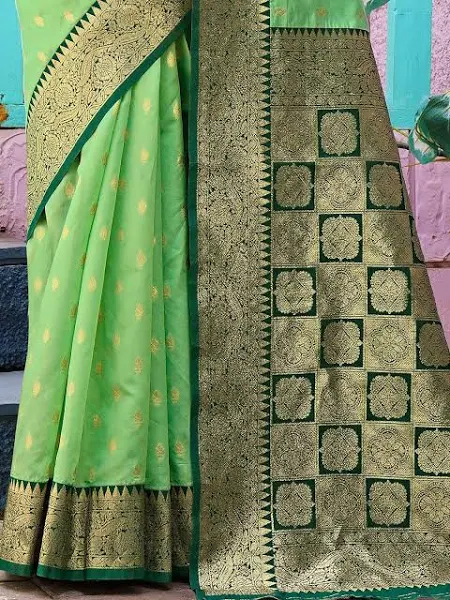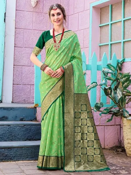 Royal Banarasi Saree Tissue Fabric – Pashmina Work – Matching Blouse Included | Lime Green