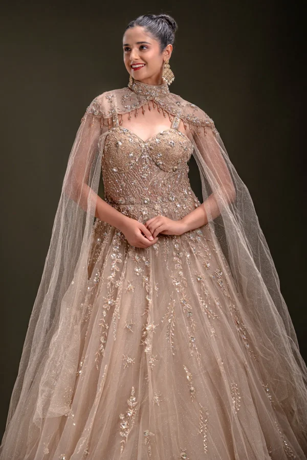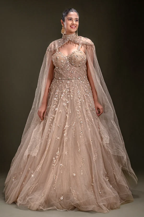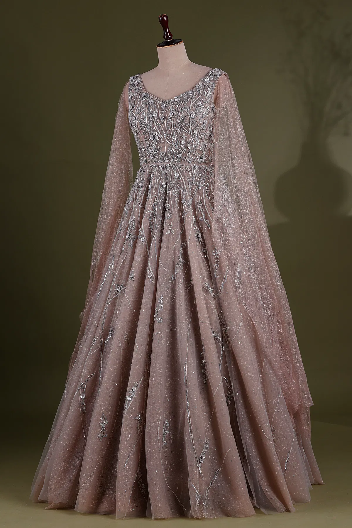 Exude glamour in this beige net evening gown adorned with sequins embroidery and cap sleeves. The flowing fabric and tailored silhouette create a flattering and elegant look perfect for weddings, receptions, or festive celebrations. The delicate sequins detailing adds sophistication while maintaining comfort and style. Pair with statement jewelry, heels, and a clutch to complete a polished ensemble. Ideal for brides or guests seeking a refined and contemporary outfit, this evening gown guarantees elegance, charm, and a memorable appearance. There might be a little color variation in the image and the original product due to the photographic lighting sources or your monitor settings.