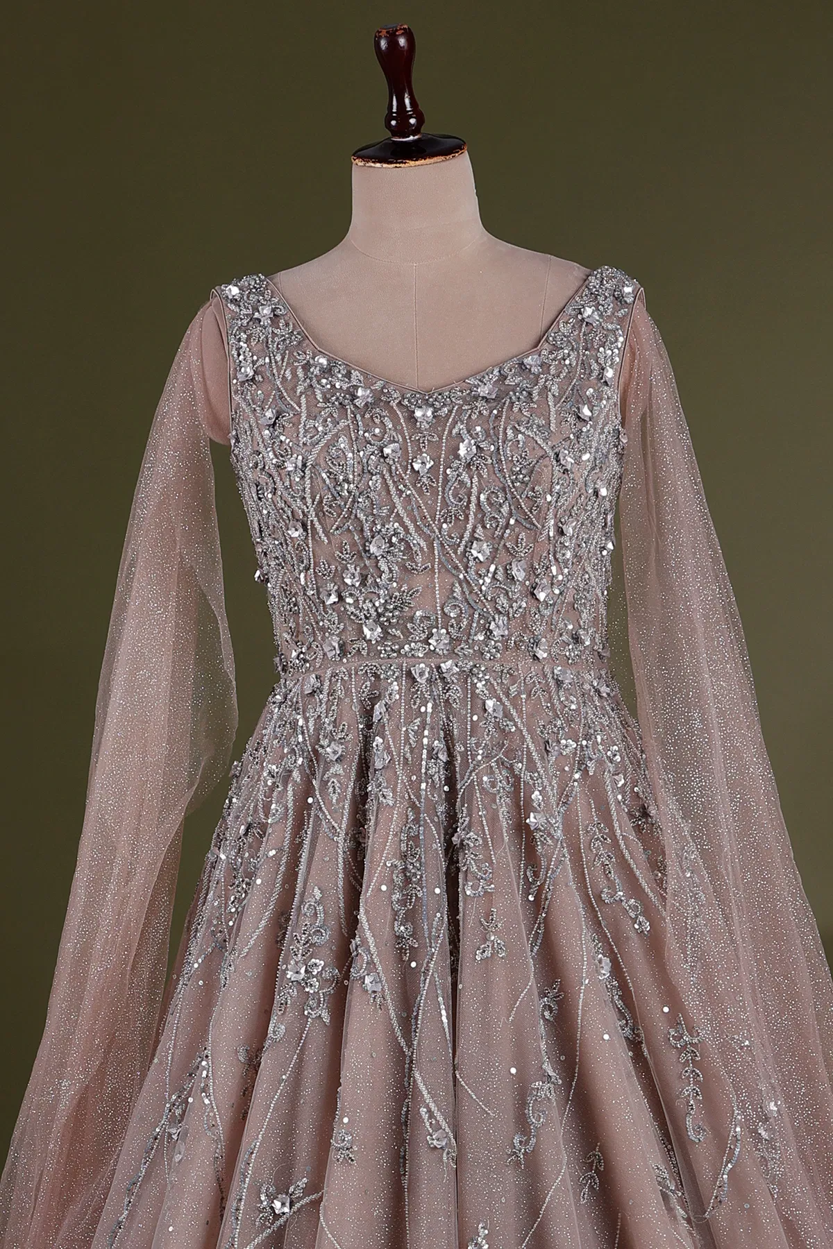 Beige Sequins Embroidered Net Evening Gown with Cap Sleeves-JE5264