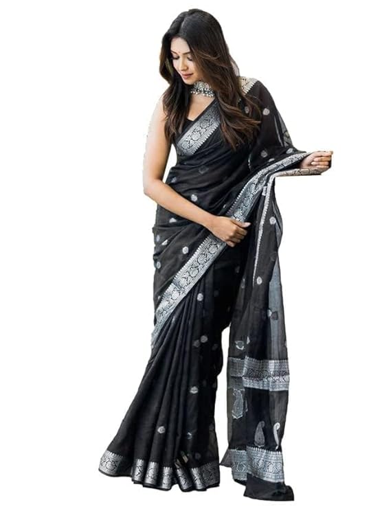 Charming Swarovski Border Saree Satin Fabric – Stylish Regular Wear with Buti Work & Decorative Border – Includes Blouse Fabric | Black