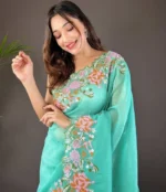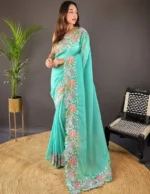 Be the first to review “Elegant Banarasi Saree Organza Silk – Minimal Border – Includes Blouse Piece | Firozi” Cancel reply