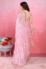 Glamorous Swarovski Border Saree Satin Fabric – Elegant Regular Wear with Sparkling Border & Allover Detailing – Matching Blouse Included | Baby Pink