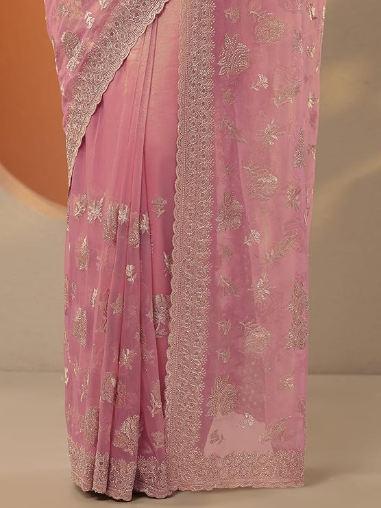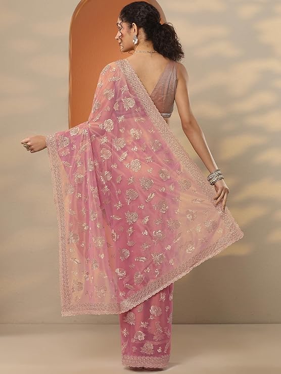 SIRIL Women's Tissue Silk Sequence Embroidery Scalloped Border Saree with Unstitched Blouse Piece