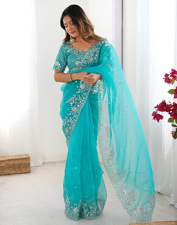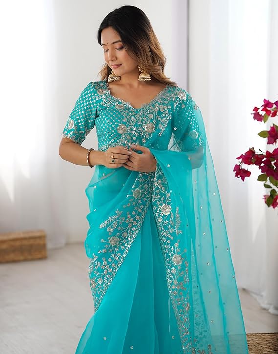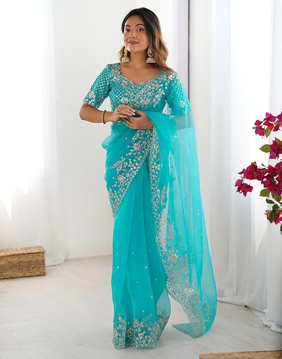 Be the first to review “Lightweight Embroidered Saree – Regular Wear with Minimal Border Style – Blouse Piece Provided | Firozi” Cancel reply