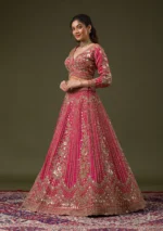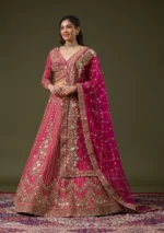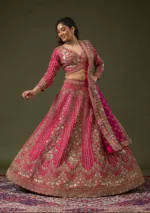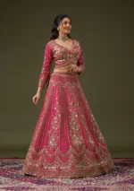 Dazzle and shine on your big day with Koskii’s magenta lehenga, crafted from the richest raw silk and intricately adorned with lavish zari embroidery. This masterpiece is a quintessence of bridal magnificence, designed to add an extra layer of glamour and sophistication to your bridal ensemble. Let every twirl light up the room, reflecting your vibrant spirit and penchant for perfection!.